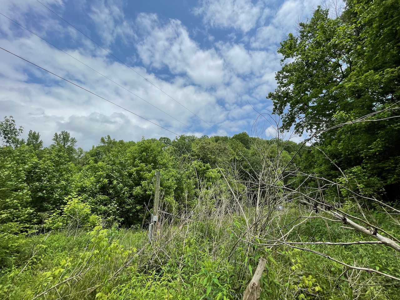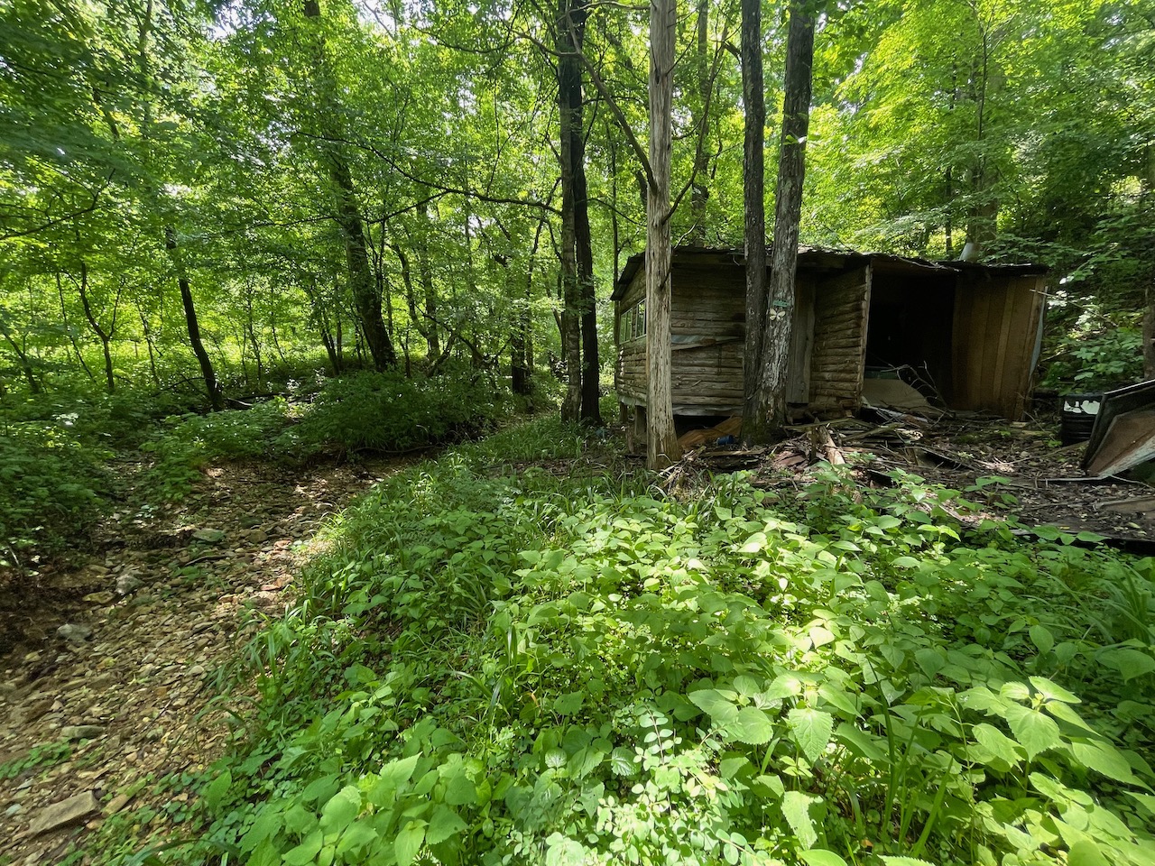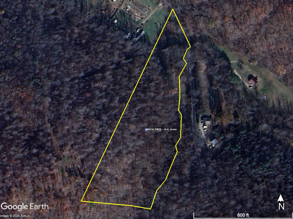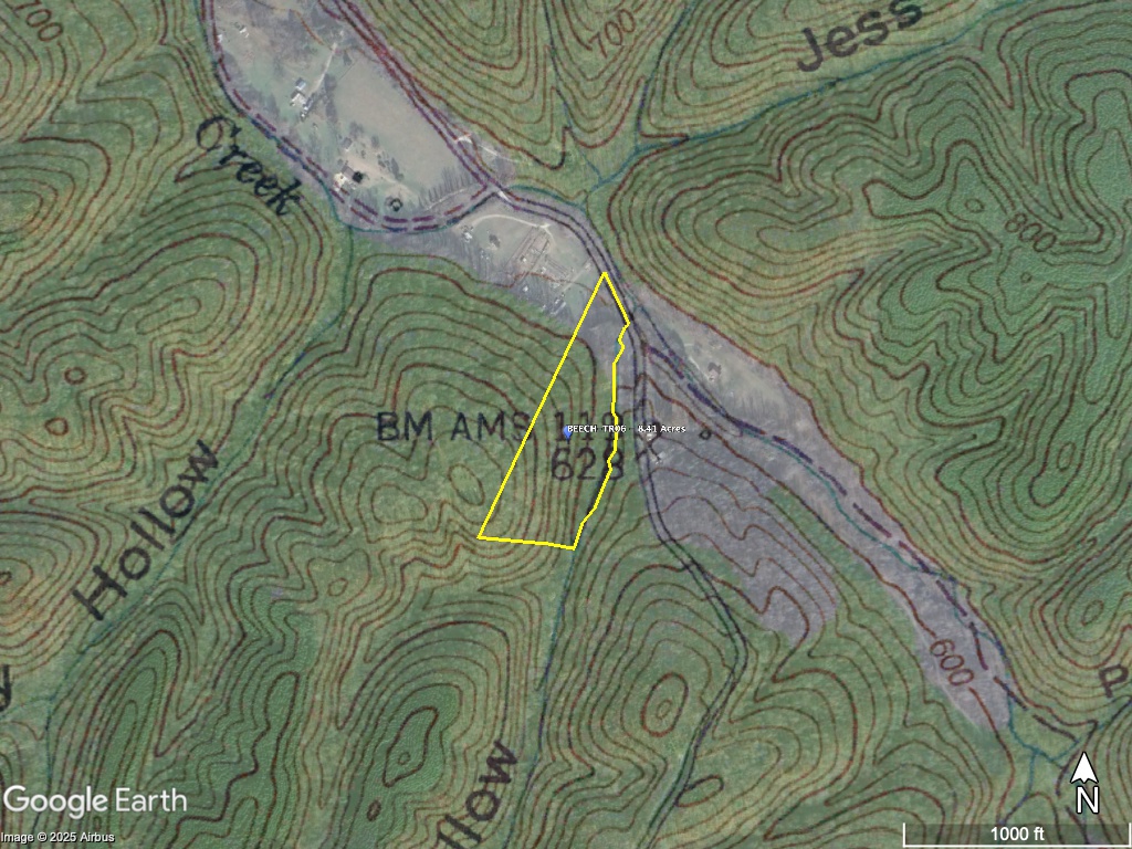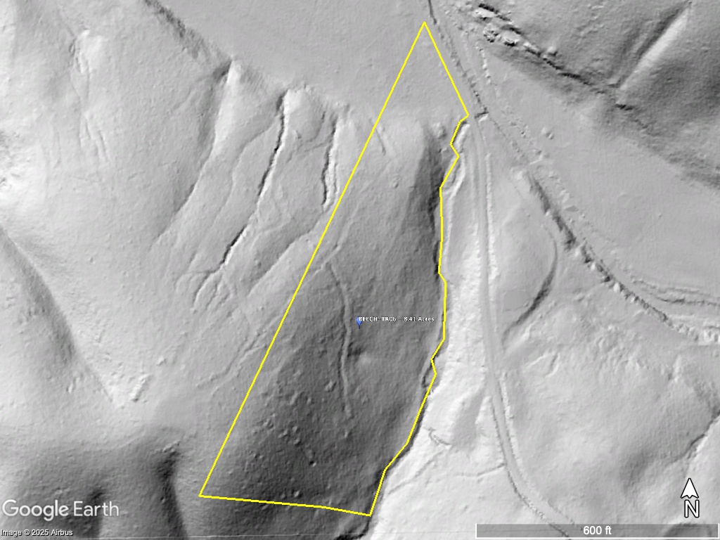 8.41 Acres – TN land for sale with power at the front of the tract. From the paved, county frontage, the tract is relatively flat and then progressively ramps up along a large hillside. From the LIDAR scan, you can see an old logging road that could be improved to get access midway up the hillside. The eastern property line follows a seasonal creek bed at the bottom of Grover Hollow. The remains of an old shanty are on the front portion of the property.