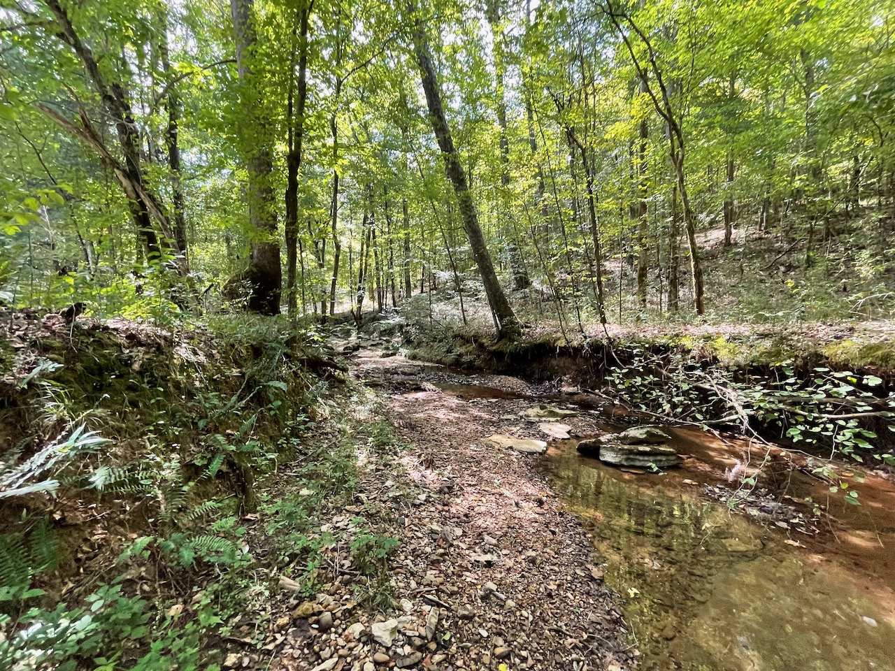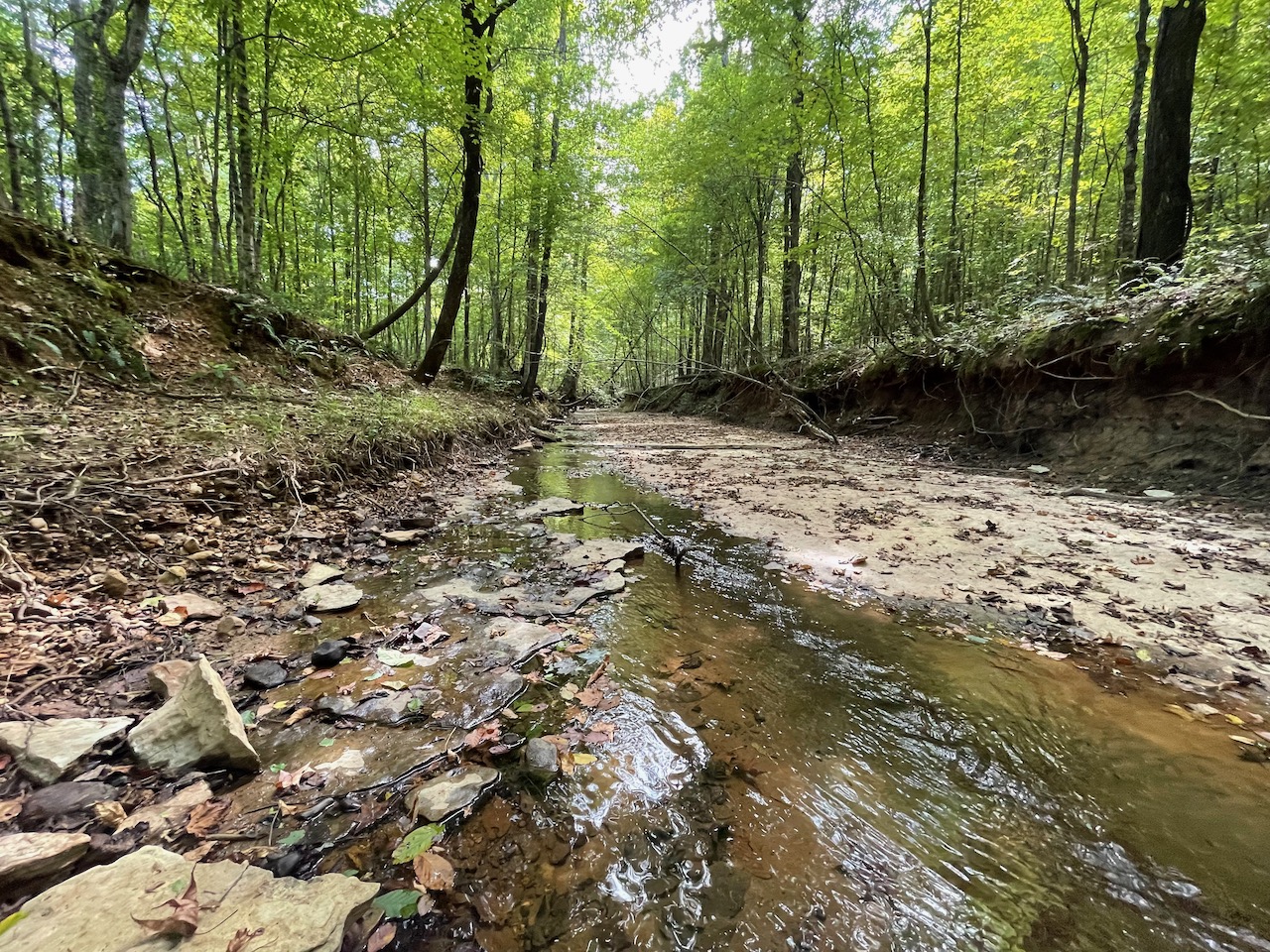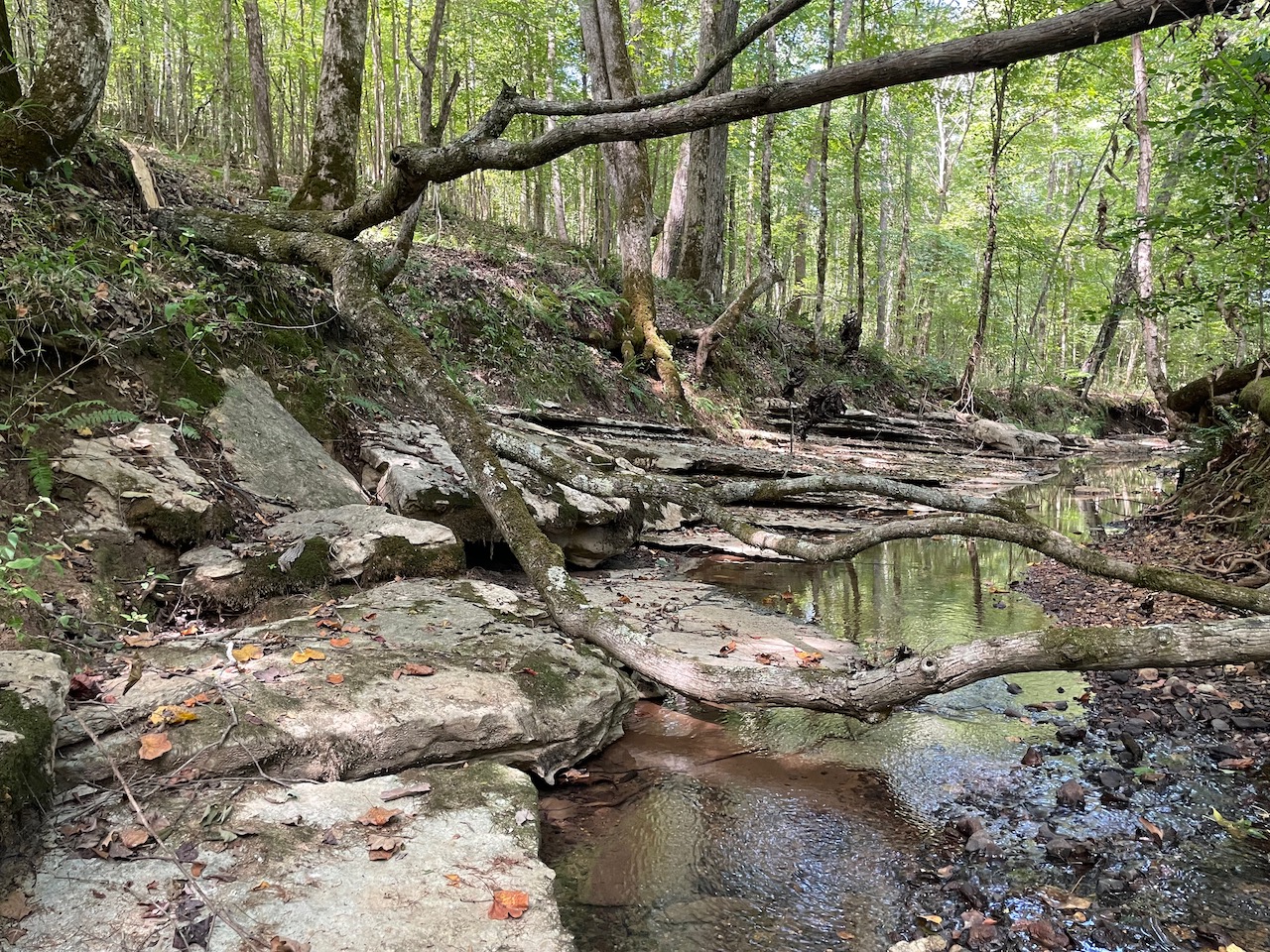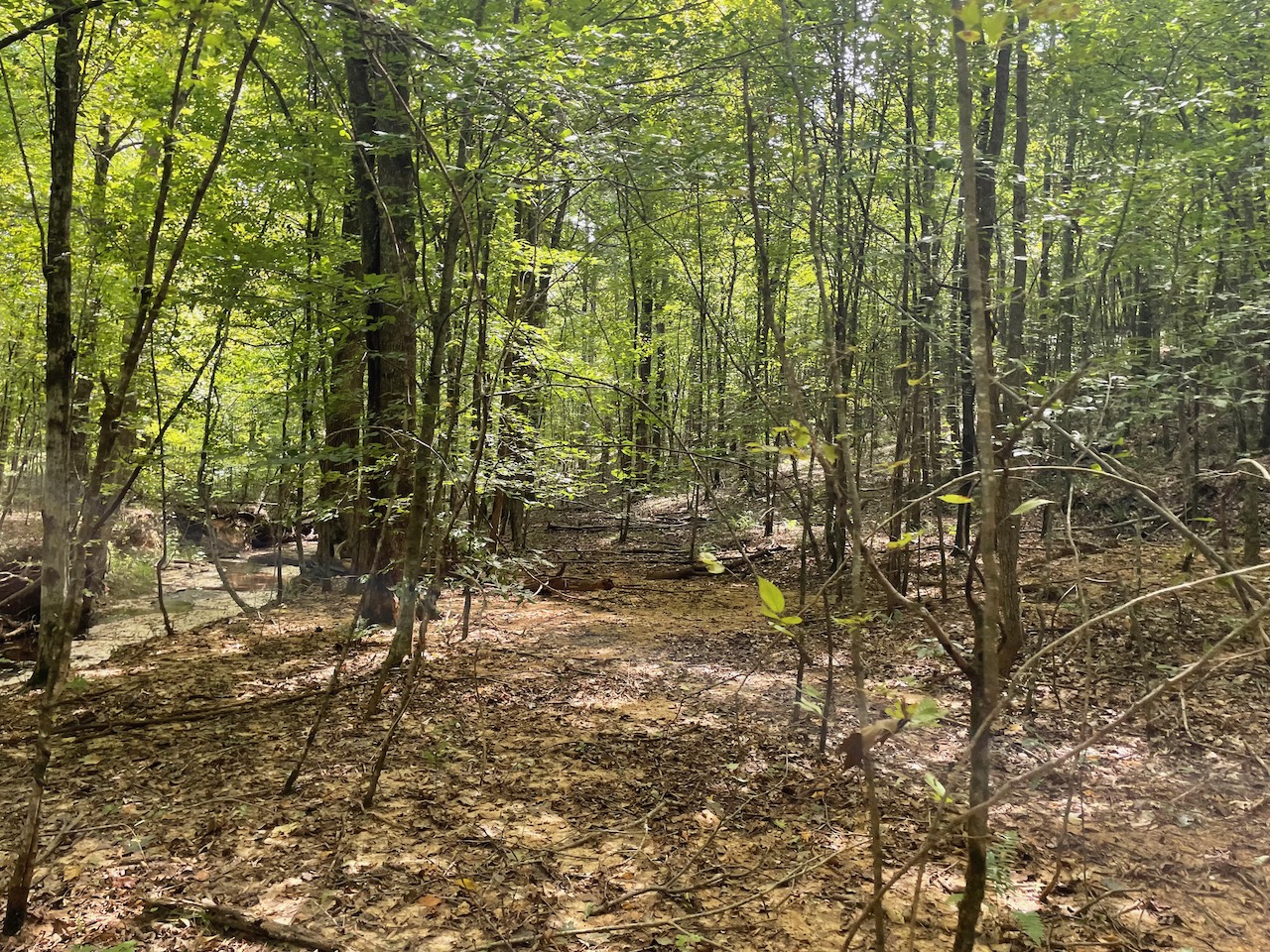 7.733 Acres – This owner financed land in Hardin County has frontage on two private roads, has a creek running through it and is partly open/partly wooded. The terrain is varied and ranges from flat land to gently sloping to steeper slopes on the western end of the property. Sweetwater Branch runs through the property and is a nice sized little creek. The land is accessed through private dirt roads that are accessible by a 4wd vehicle with a little bit of ground clearance. This land would be ideal for a weekend getaway, hunting, or for a remote off the grid homestead.